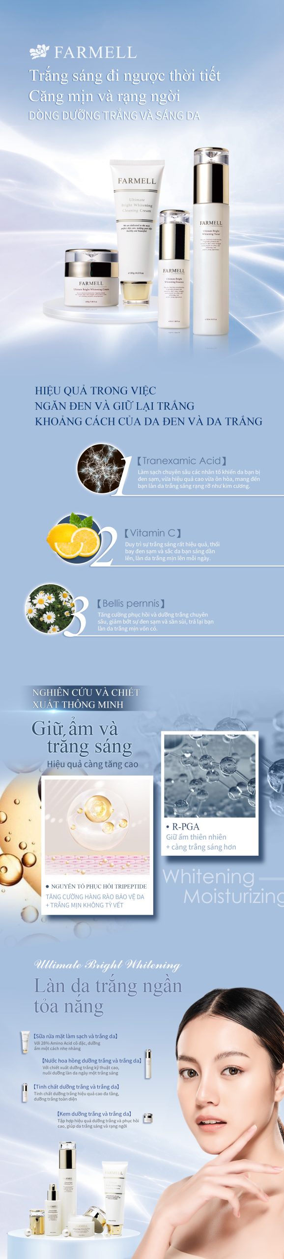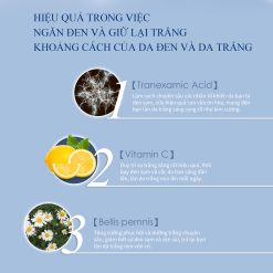 Hiểu quả: Chiết xuất từ thành phần tinh chất dưỡng trắng phức hợp hiệu quả, phân tử nhỏ, giúp lên da sáng trắng suốt thời gian dài, màu da đồng đều, làm tăng sự mịn màng cho da, tái tạo làn da trắng sáng, hoàn hảo không tỳ vết.